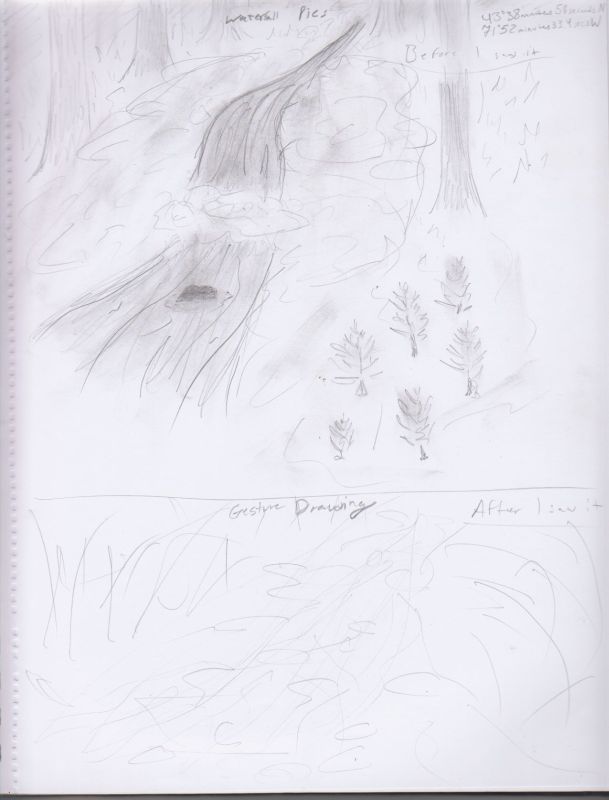 We used movement to get there, and our ideas moved with us, too. There was a cellar hole on the way to the trailhead, where someone had moved there, built a house, and then moved away again. We hiked to a small stream and, of course, the water and some of the [rolling] rocks were moving with it. We saw woodpeckers darting around and pecking at trees. After we explored that, we continued our hike to the falls. We went to a small cave in the rocks above the falls. The water was falling down even larger rocks and flowed downstream. We were climbing around on some of the boulders in the stream that the waterfall led to, and I almost slipped off of one and fell right into the water. After that, we did a bunch of sketching and walked back.