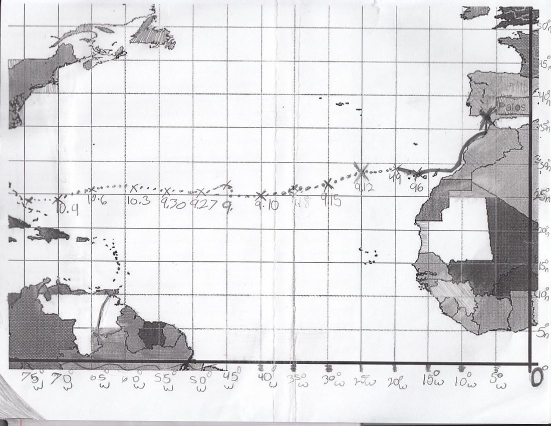 The three ships set sail from palos, and head for the Canary Islands Columbus leaves thecanary island behind slow going in the sargasso sea, then fresh winds, and - at last - land