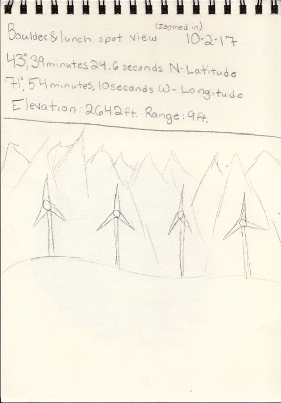 During day 2 at Cardigan Mountain, our group hiked up Firescrew, then Cardigan, and headed to Rimrock and South Peak. Through the day we saw many different things that had to do with Human Environment Interaction. When we first started the trail to Firescrew, we came across a human made cellar. The humans who made this interacted with the environment, therefore this is an example of human environment interaction. At the top of Cardigan is two more examples of human environment interaction, the fire tower, and the markers engraved into the rockface top. Humans put these on the summit, they are not part of nature. Our group created some examples of human environment interaction, such as leaving peanuts from trail mix behind, or even peeing in the forest. Someone dropped a cookie at our lunch area, where we looked at windmills in the distance, another example of human environment interaction.