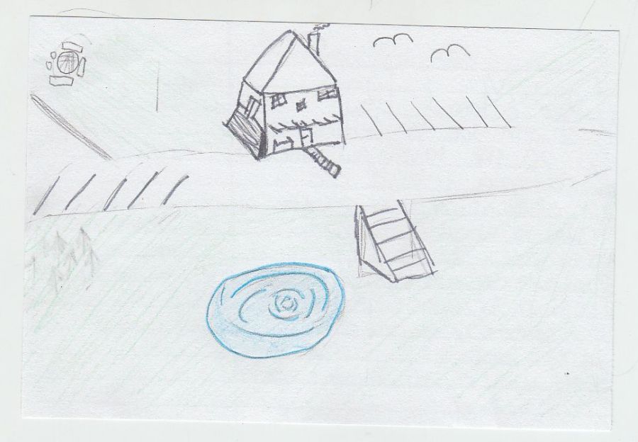 Outside of the lodge there is a pond, and a fire pit. the fire pit is about