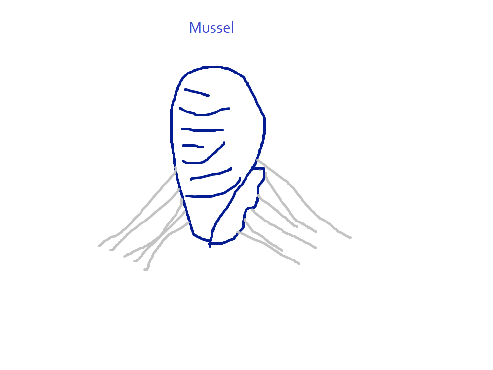 This is a drawing of a mussel that you can actually find at Odiorne. Mussels are really cool creatures that attach themselves to rocks using little strands that they shoot out of their bodies. These are called byssal threads. When I was at Odiorne, I found a mussel that had these threads attaching it to a rock. This was really cool and I am glad that I found it. I was surprised at how strong these threads were, but I think that if I tried, I would have been able to rip the mussel off of the rock.