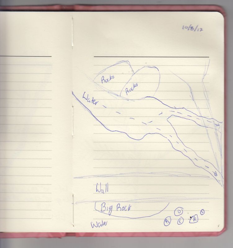 Right off the bat we ran into another old cellar hole. I don't know why but I'm obsessed with historical things like that. That was my first like good sketch I was very proud of it. We walked along ways and passed groups and found some hidden secrets in the forest. We had finally made it to the field that was so steep I thought I was going to fall backwards my group made an awesome fort. Then we headed back down and I fell three times. I saw all of my friends and it was a blast I wish we could go there again.