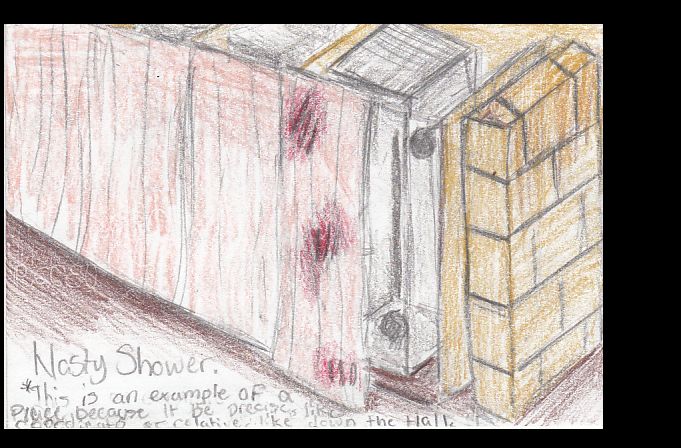 This is a picture I drew of the disgusting showers in the AMC Lodge. I drew this on the back of a postcard I sent to my parents as a assignment for geography!