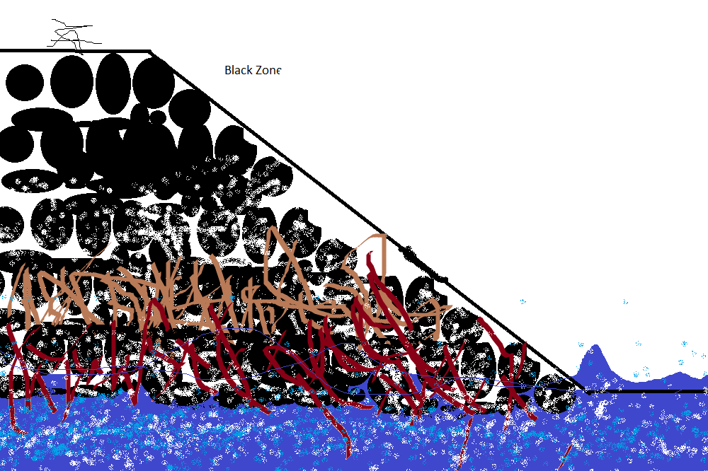 The red zone has the most varity. bbecause that is where water is almost all of the time so sea life can flourish. Also lots of nutrients is washed down from the rocks when the tide goes down. This causes the fish and sea creatures to grow and populate.